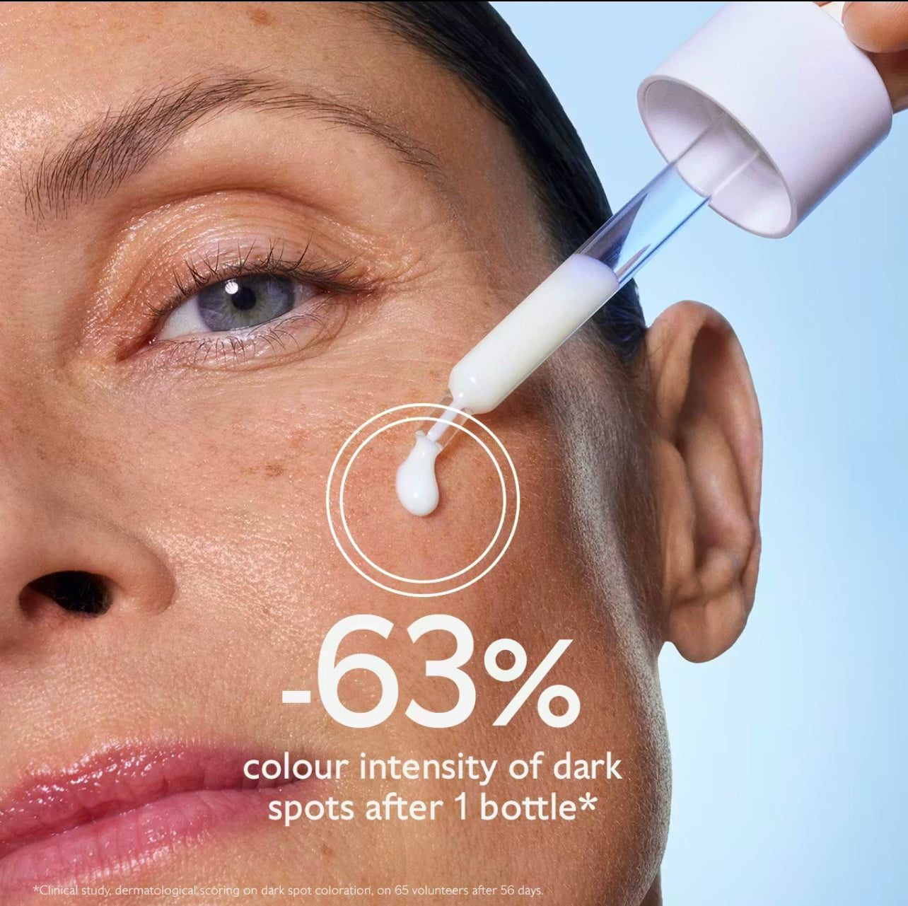- Dark Spots visibly reduced by 63% after 1 bottle on all skin tones and by 81% on phototypes 4, 5, and 6